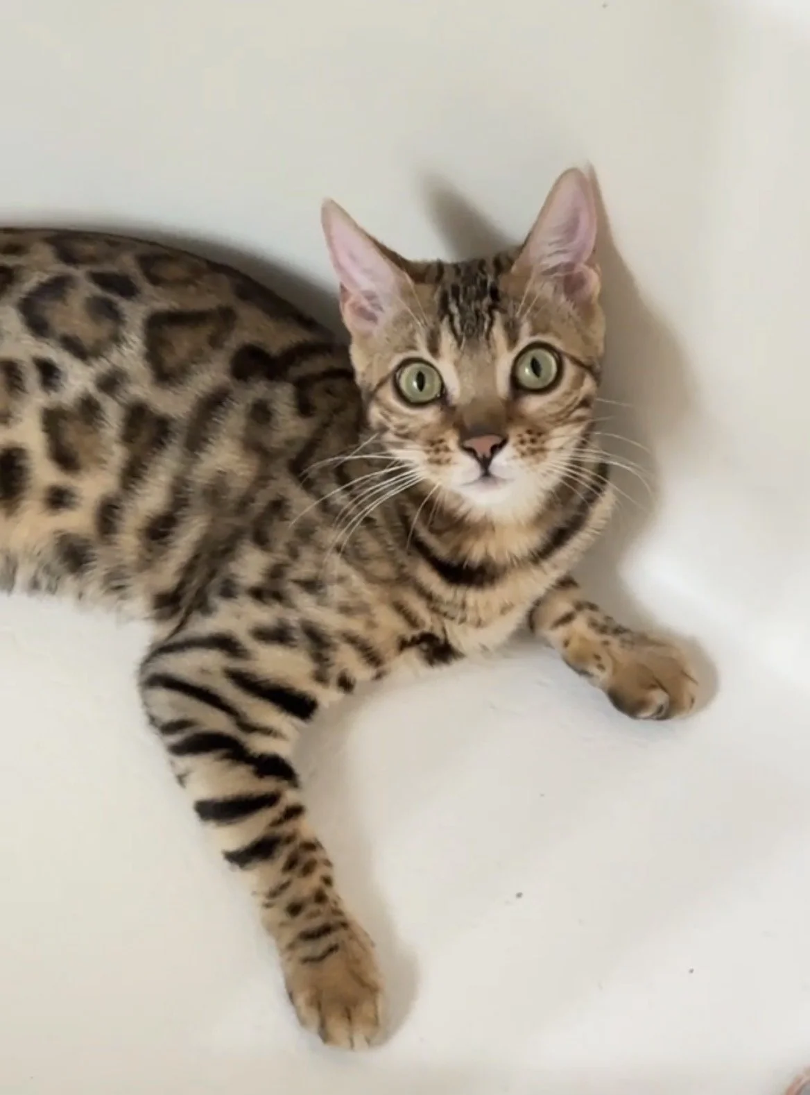 Zeraphina is our radiant golden Bengal Queen, born in Spain and bred by Embrujo Bengals. From the moment she arrived, her expressive eyes and blood contrast captured our hearts. Her coat glimmers with golden tones and perfectly outlined rosettes, showing the true essence of the “mini leopard” look we strive for at Majestic Gem Bengals.
